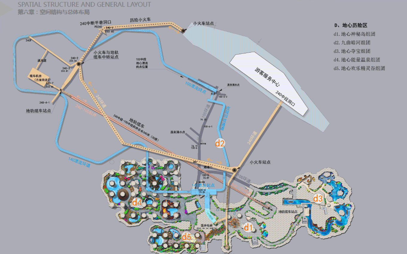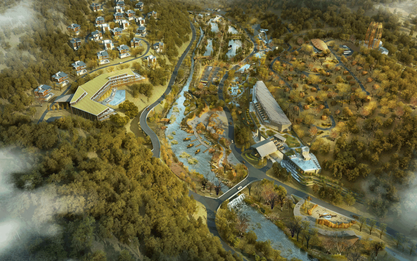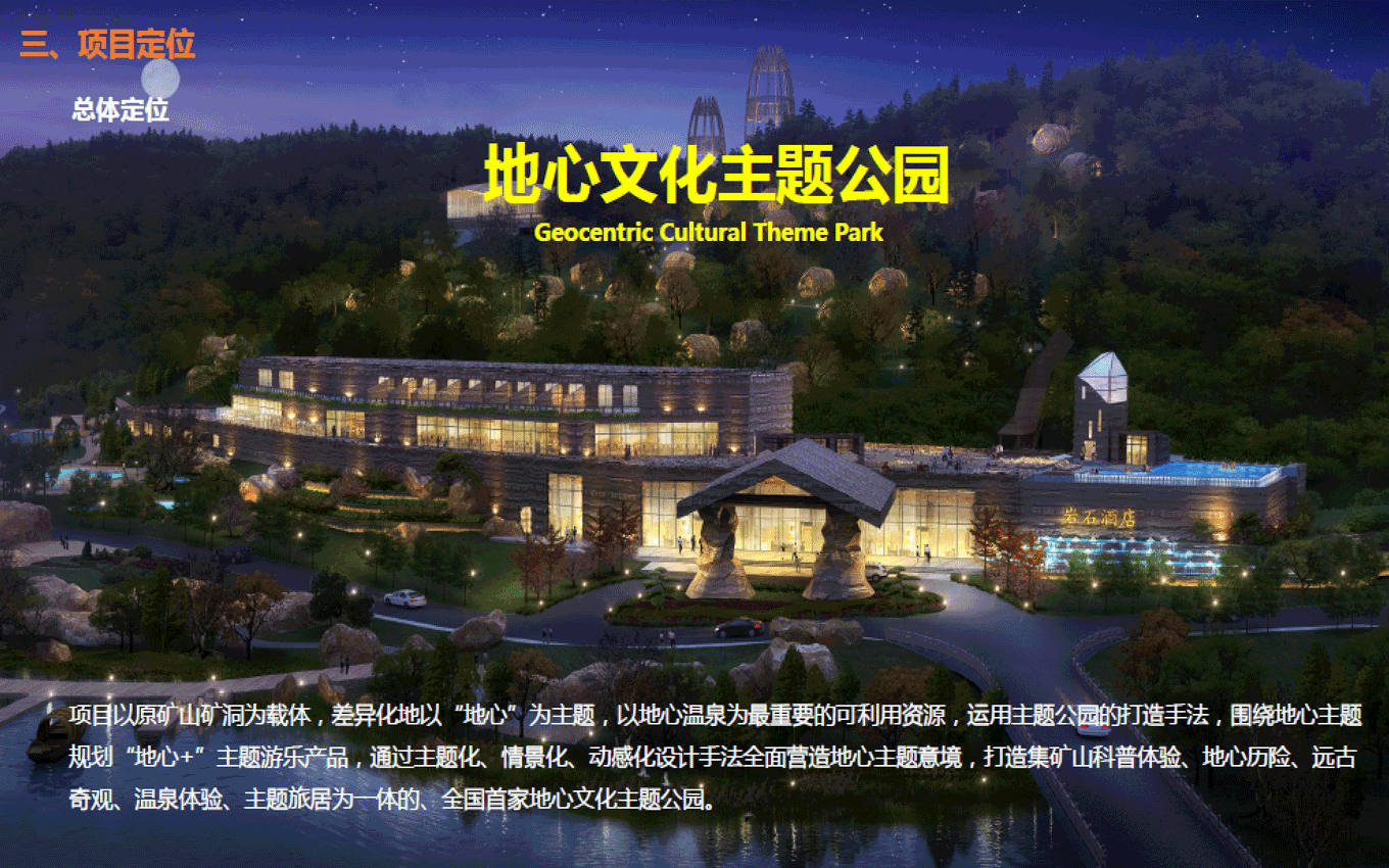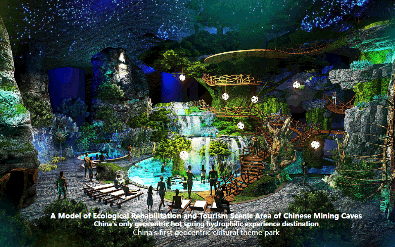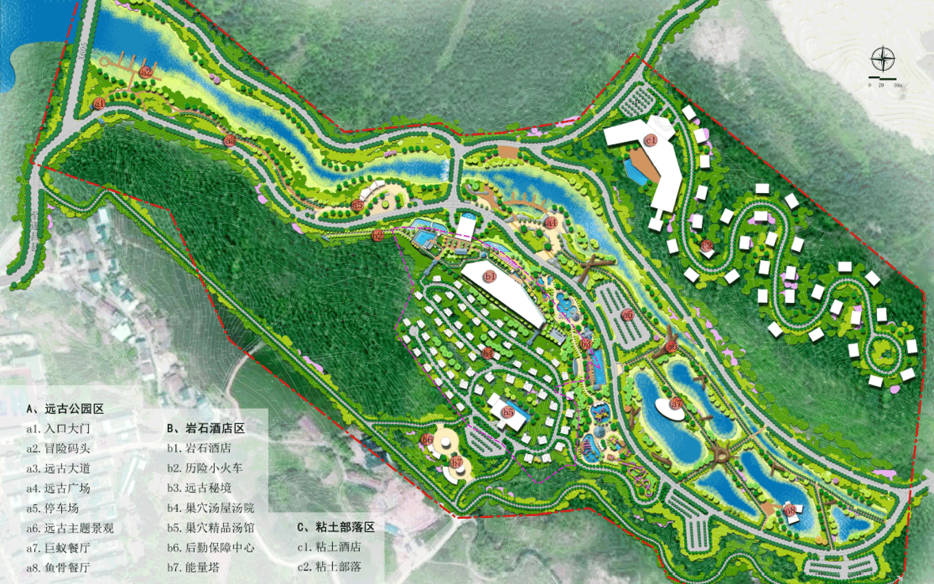 遠古公園景區(qū),位于規(guī)劃區(qū)中部,為東西走向的兩山相夾谷地地形東部直接連接605縣道,西部與農田相接。絕大部分為原礦山尾水排放區(qū)域,業(yè)主方要求打造成濕地公園遠古公園度假景區(qū)功能定位,景區(qū)形象展示、停車服務、休閑公園、污水凈化、主題餐飲。目標市場為家庭游和主題游樂客群;策劃理念是利用交通對接便利的條件,展示地心公園主題形象和主題景觀,配建停車、餐飲等配套服務功能,遠古公園以遠古濕地為形態(tài),以遠古荒蕪為景觀風格,實現(xiàn)遠古公園與地心公園整體風格的協(xié)調統(tǒng)一。