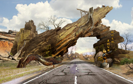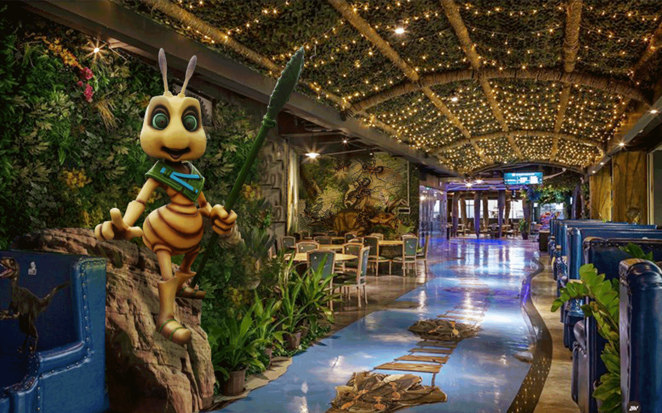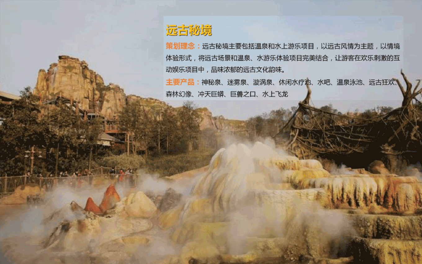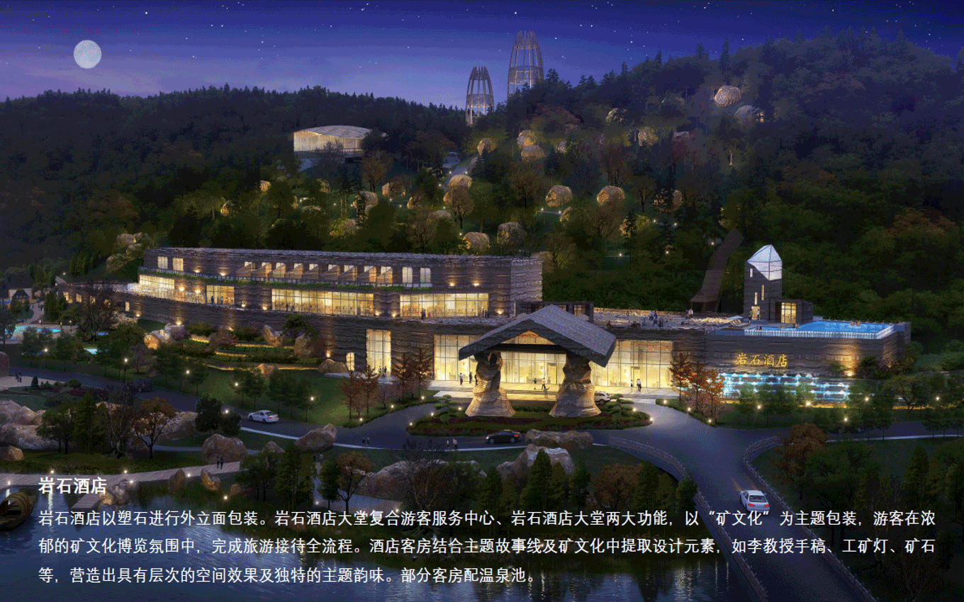度假溫泉度假區(qū)入口大門/遠古大道/遠古廣場/遠古主題景觀圍繞地心文化主題,提取巨型動物化石、枯樹木、獸骨、蛛網、石堆、龍蛋及主題故事線中IP形象等元素進行主題包裝,營造遠古時期原始、神秘、荒蕪的主題場景,激發(fā)游客的好奇心,快速進入設定的的主題故事中。