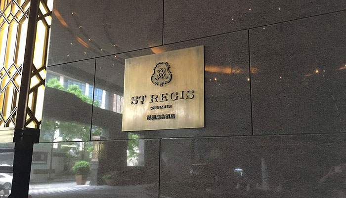 在標識設計的時候,主要以青古銅結合裝修的色彩搭配。瑞吉酒店標牌把瑞吉酒店展現(xiàn)的淋漓盡致。