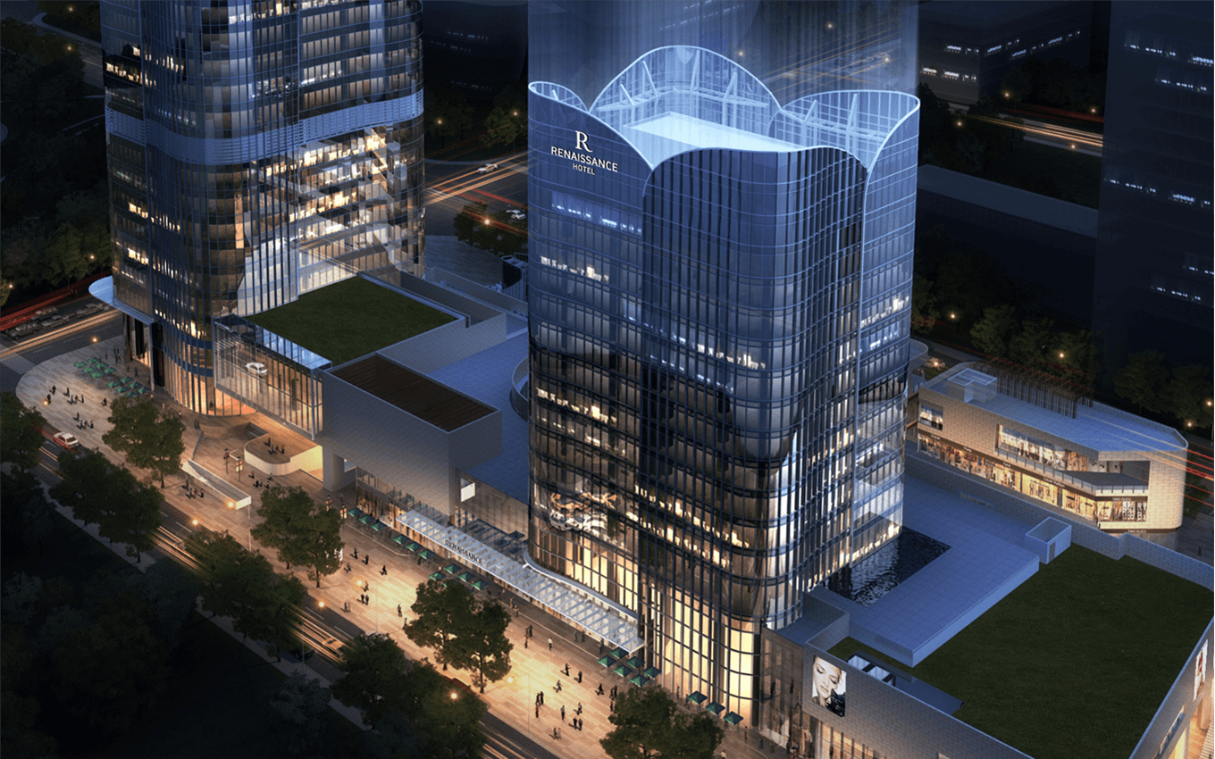 萬麗酒店總建筑面積:200653.85㎡,其中地上建筑面積122504.63㎡,包括1棟43層(79619.86㎡)的超高層國際5A甲級寫字樓(T1塔樓);1棟18層(33500㎡)的國際知名品牌酒店(T2塔樓);1棟獨棟及商業(yè)裙樓(7120.98㎡);五層地下室總建筑面積78149.22㎡,包含5000㎡的商業(yè)地下室,1216個機(jī)動停車位及設(shè)備用房。
